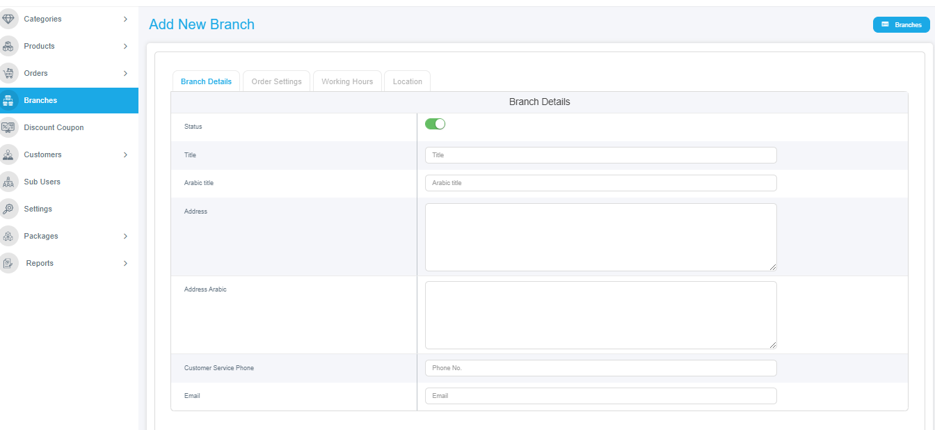 3. You will be facing the "Branches" main interface, find the "Add New Branch" button at the top of the page to the right and click on it,